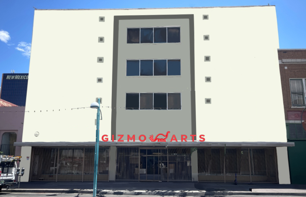 In 2025, Sanitary Tortilla Factory relocated to the former Gizmo Store building and became Gizmo Arts. Located in the heart of downtown Albuquerque, the Gizmo building has long been a visual anchor in the city’s landscape. Built in 1951, it housed a series of light industrial and commercial uses, formerly a JCPenney’s department store, but became widely known as the home of The Gizmo Store, where it got it’s nickname, a beloved local department store, known for a skateboarding, dinosaur outside its doors greeting visitors.