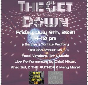 Sanitary Tortilla Factory is proud to host “The Get Down”, a Blick Lives Matter ABQ event. Join us on Friday, July 9th from 4-10 pm. There will be food, vendors, art, and music including live performances by Chloë Nixon, Khali Sol, Z THE AUTHOR, and more!